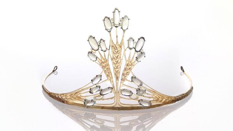 一顶冠冕,约1990年制作,以月光石和玉米图案为特色。